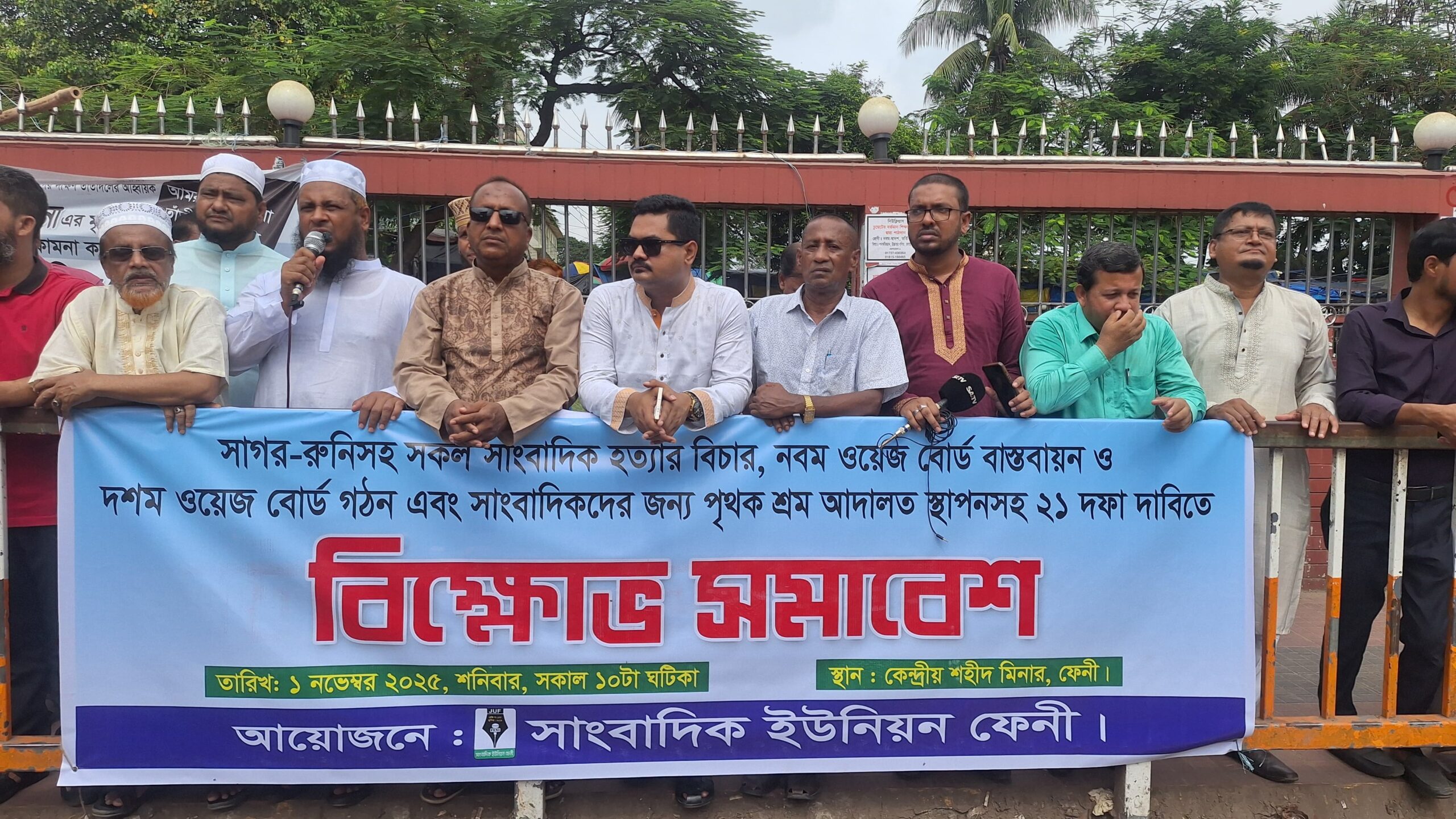 সাগর-রুনি হত্যা মামলার বিচার, নবম ওয়েজ বোর্ড বাস্তবায়ন, দশম ওয়েজ বোর্ড গঠন এবং চাকরিচ্যুত সাংবাদিকদের পুনর্বহালসহ ২১ দফা দাবিতে ফেনীতে বিক্ষোভ সমাবেশ করেছে সাংবাদিক ইউনিয়ন ফেনী।